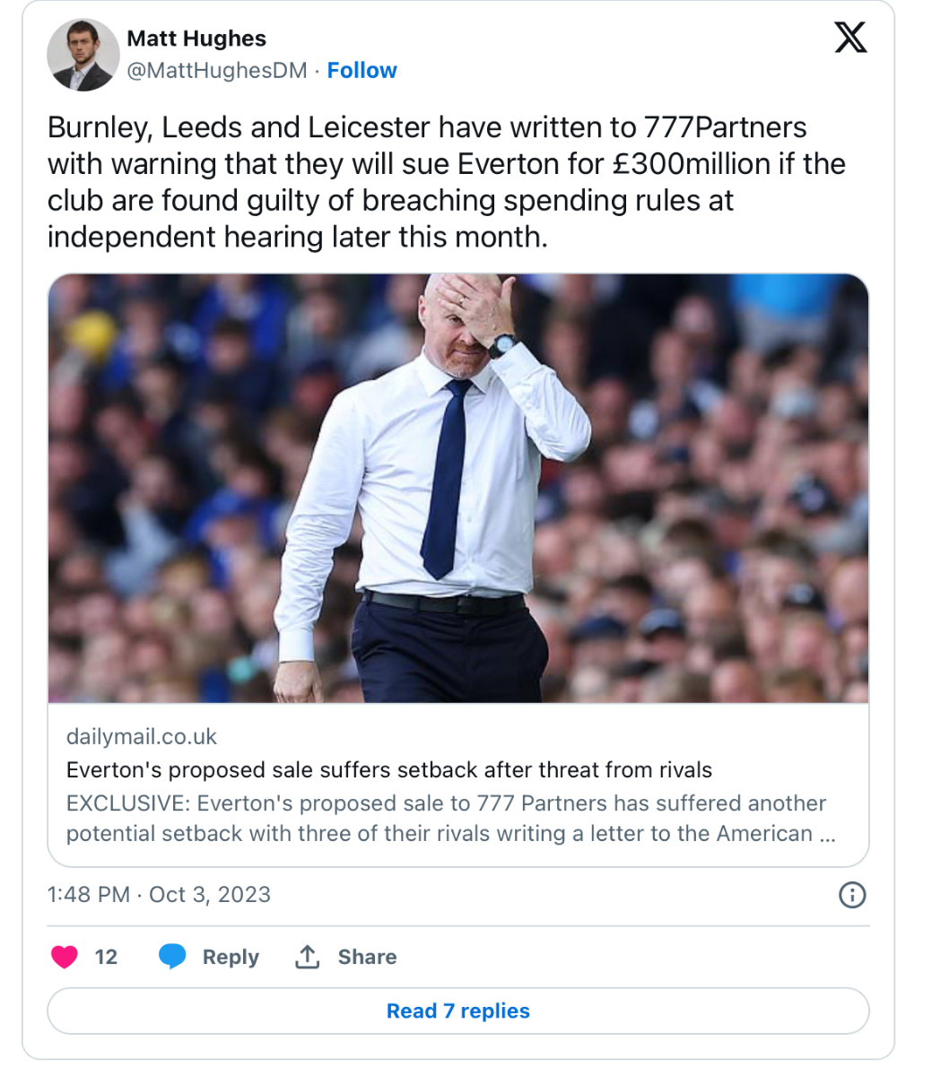 https://theesk.org/2023/10/01/777-partners-moshiris-final-misjudgement/ We have extended our credit facilities to the point where every asset of the club is encumbered – We have £490 million of shareholder loans – a certainty to be written off by whomever becomes the new owner of Everton Football Club. We have a £200 million rolling credit facility provided by Rights and Media Funding – funding provided by offshore entities ultimately controlled by Michael Tabor – at rates I am informed of, at 12% pa. This is secured against all assets of the football club, including bank accounts, bar the stadium (as below) We have £140 million of debt provided by MSP Sports Capital (including Andy Bell and George Downing as limited partners) – secured against the shares of the Everton Stadium Development Holding Company We have a small Covid related loan of approximately £25 million with Santander In addition, we have emergency funding provided by 777 Partners as they proceed through the regulatory process, looking to acquire approval from the Football Association, the Premier League and the Financial Conduct Authority. The overwhelming evidence from my perspective is that Moshiri, despite the huge financial commitments he has made (which must be acknowledged) has failed us. His introduction of 777 as his chosen successors to his calamitous tenure is his final act of folly. 777 partners, in my opinion, are not appropriate buyers of Everton Football Club, from a moral, ethical, financial, managerial and immediate needs based perspective. I understand entirely the view (almost certainly, fact) that without an immediate or near immediate buyer the existential crisis Moshiri spoke of will occur. We, a 145 year old institution, will go out of business. However, that doesn’t mean that 777 Partners are the solution to our problems, the reverse is true in my opinion. All stakeholders, supporters, investors, local business people with the means, politicians, even the footballing authorities must see what is ahead of us and act accordingly. A solution different to 777 Partners has to be found – even at this very late hour
